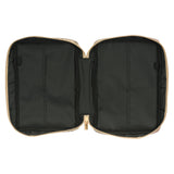 The case is designed for support and durability, with a honey-brown faux leather panel inset at the zipper and a matching faux leather lay-flat handle at the top. The zipper sports a gold metal zipper pull, and inside the case, you will find two pen loops to store pens or highlighters.