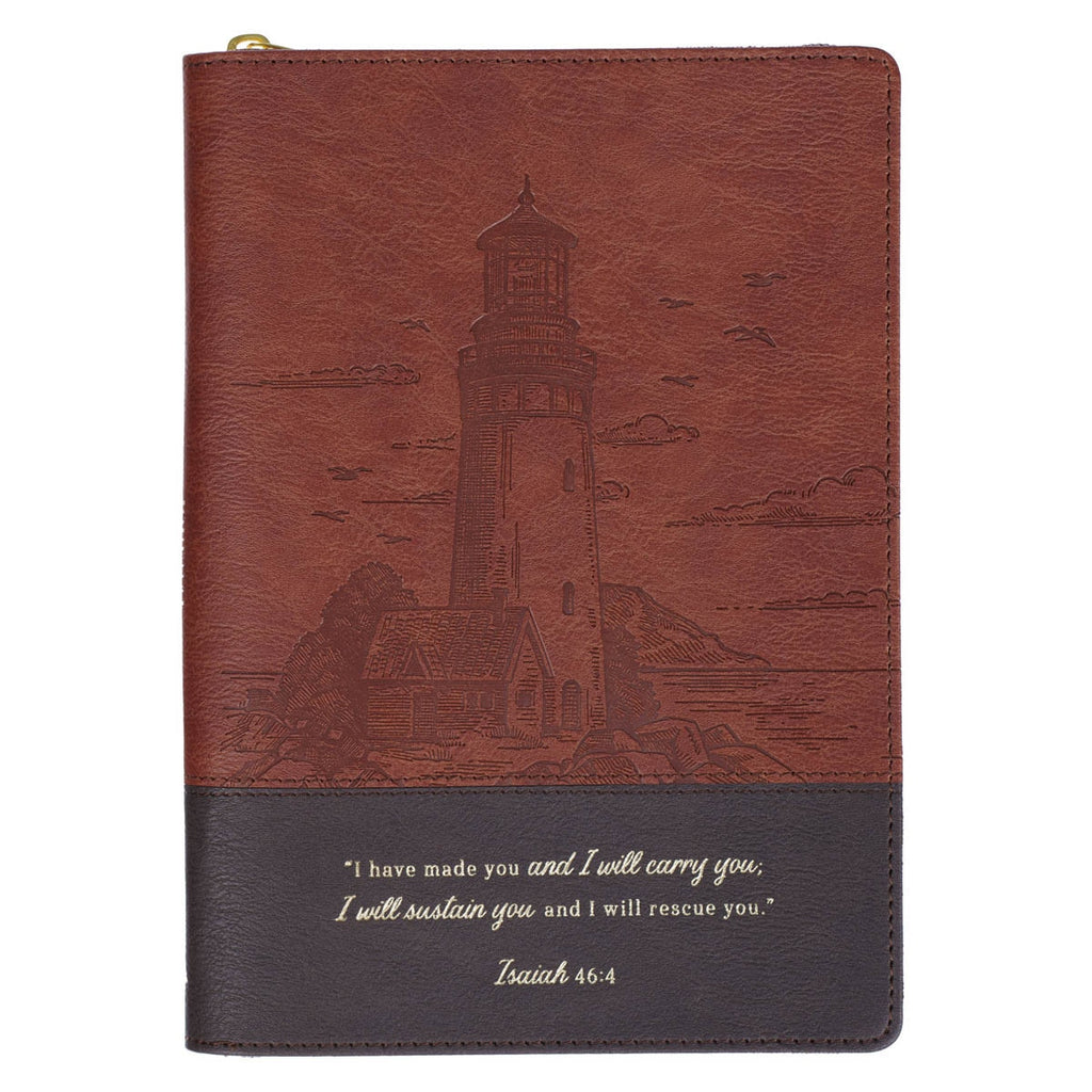 The I Have Made You Two-tone Brown Faux Leather Classic Journal with Zipper Closure is part of the I Have Made You Lighthouse Collection, which also includes a magnetic bookmark set, a faux leather bookmark, a faux leather journal, a ceramic coffee mug, a spiral journal, a reusable shopping bag, a faux leather Bible cover, a spiral notebook, a weekly desk top planner and a gift bag.